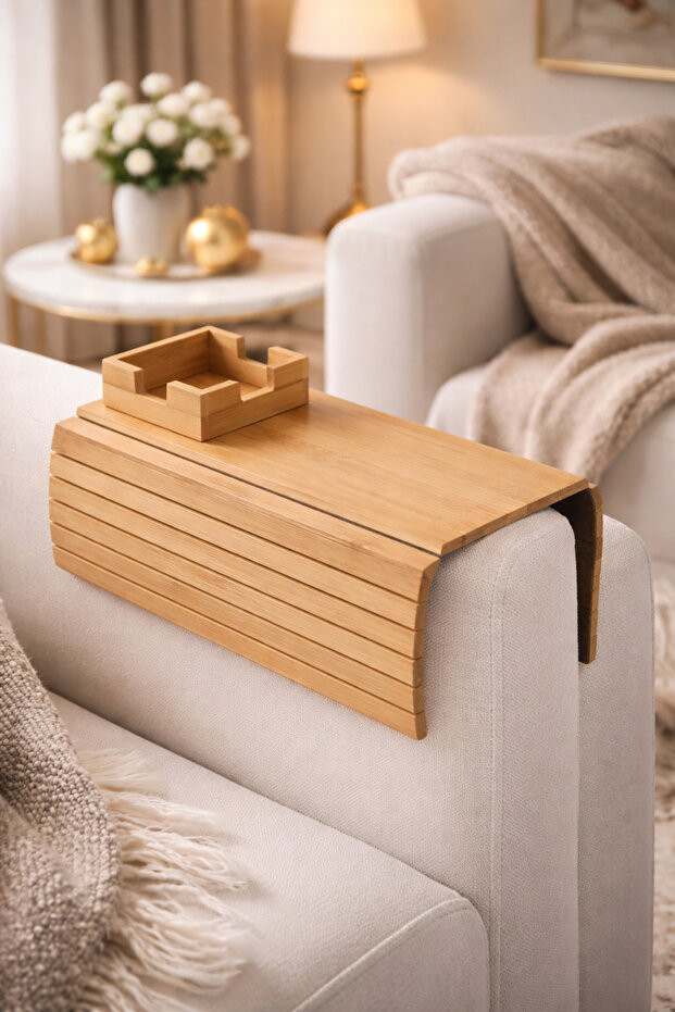 Evde rahat ve şık bir kullanım sunan Bambu Koltuk Tepsisi, koltuk kolçaklarının üzerine sabitlenerek pratik bir yan sehpa işlevi görür. Orta sabit tasarımı ile bardak, tabak, laptop veya atıştırmalıklarınızı güvenle yerleştirmenizi sağlar.