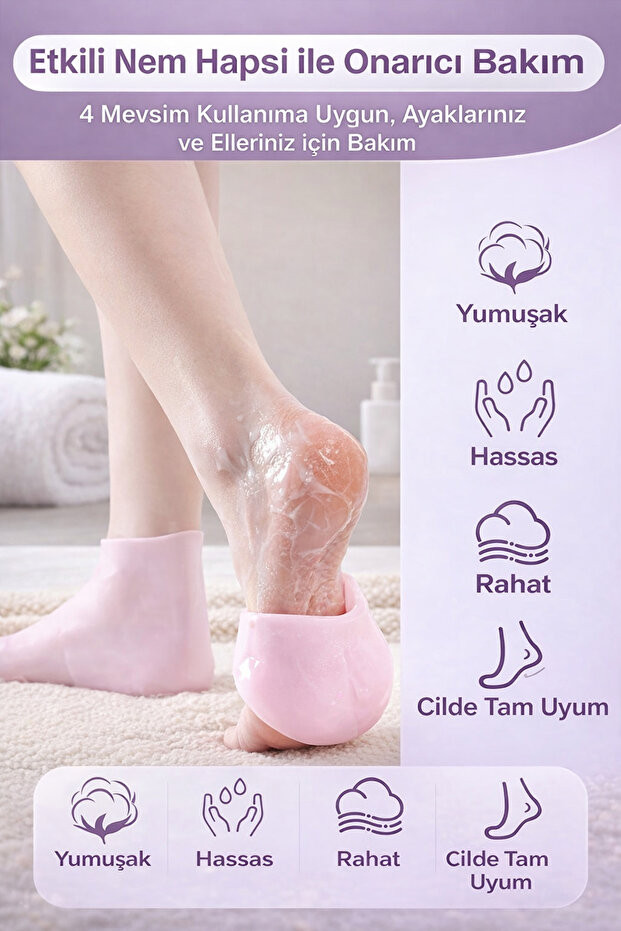 Yumuşak ve esnek tasarımı ile her ayak ölçüsüne uyum sağlar, gece veya gündüz kullanım için idealdir. Düzenli kullanımda sertleşmiş topuk derisini yumuşatır ve çatlak oluşumunu engeller. Evde veya seyahat sırasında hijyenik ve rahat bir bakım sunar.